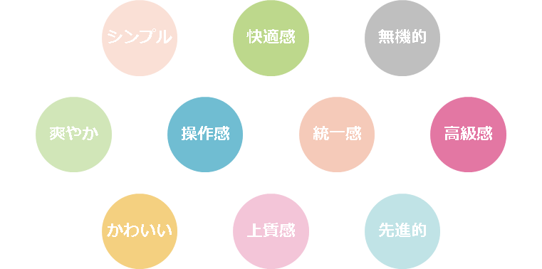 感性工学とは、広島大学名誉教授の長町三生先生が提唱した学問で,人の感性を商品設計に活用する技術分野です。感性工学を活用して人の心や感じ方などを商品に反映させることで,「価格や性能が同程度の他社商品より高級感がある」「使い心地が良い」など,感性に訴える+αの価値を付与し, 差別化を図ることができます。